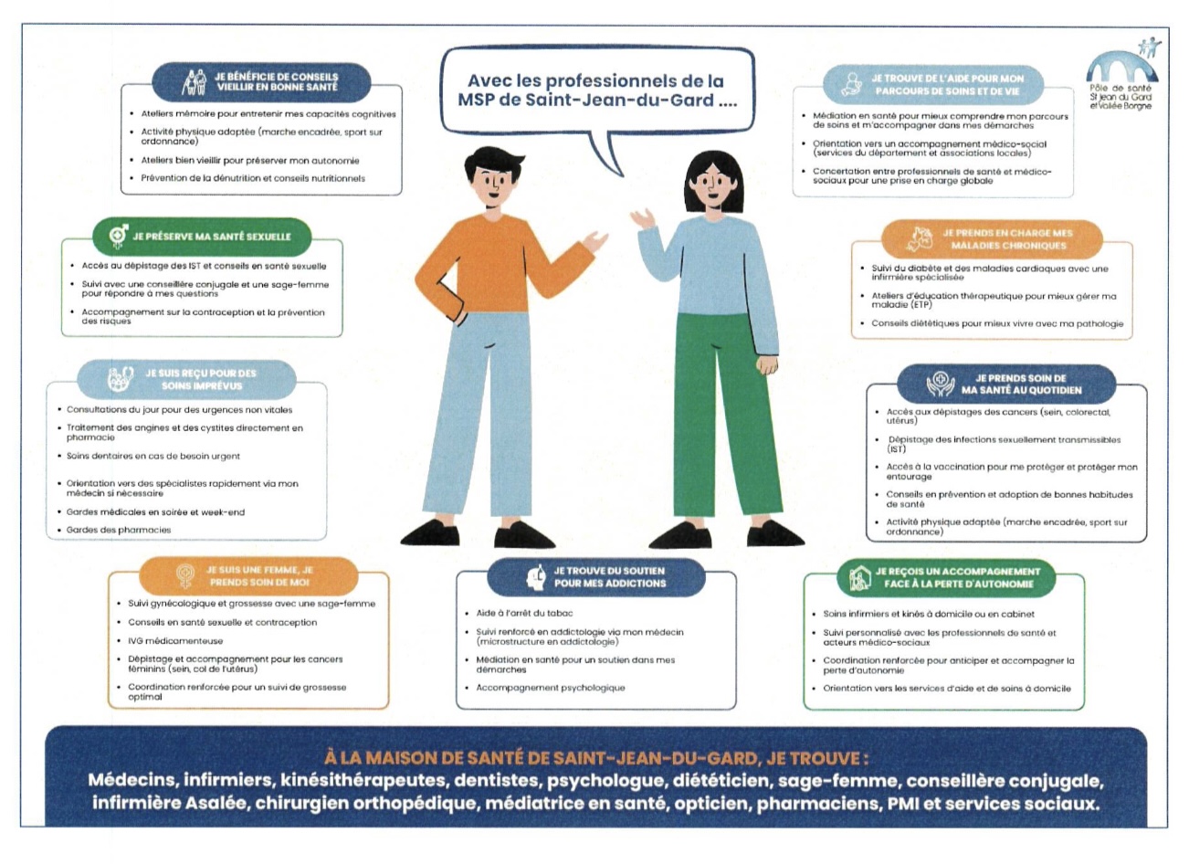 Les professionnels du Pôle de Santé de Saint Jean du Gard et de la Vallée Borgne se sont regroupés autour d’un projet de santé. Ils souhaitent travailler ensemble pour offrir aux patients une meilleure qualité de soins. Le patient est au centre du dispositif et les professionnels de santé se coordonnent pour assurer une prise en charge adaptée.